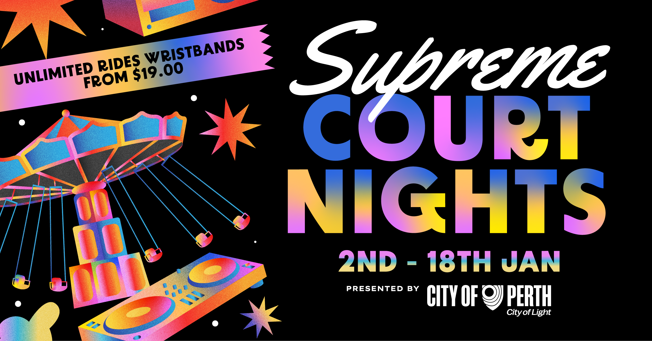 Kid Luna Park is just one of the many of Carnival Amusements yearly events. Other large-scale events I’ve contributed to include Jurassic Kingdom at Burswood Park and Schools Out Winter Fest at Perth Convention and Exhibition Centre. These two were designed in collaboration with Ryan Meotti (Studio Mesa).